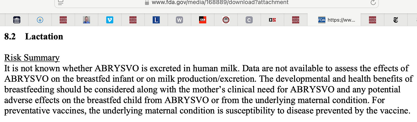 The RSV shots caused quite common premature labor in clinical trials, which led FDA to restrict the time period during which they could be given to later in pregnancy, in an attempt to avoid premature deliveries. However, the shot still causes premature labor, only many of the fetuses are older and more developed when they are delivered earlier, under the new guidelines. This reveals the FDA knew about the problem and approved the shots anyway. Even though the net benefit is probably negative and 1% more total pregnancies were premature in the vaccinated group than the placebo group. By pushing the shots off until later in pregnancy, more babies will be born early, but in the final 4 weeks of a pregnancy, when they no longer meet the definition of “premature” and are not identified in the label.