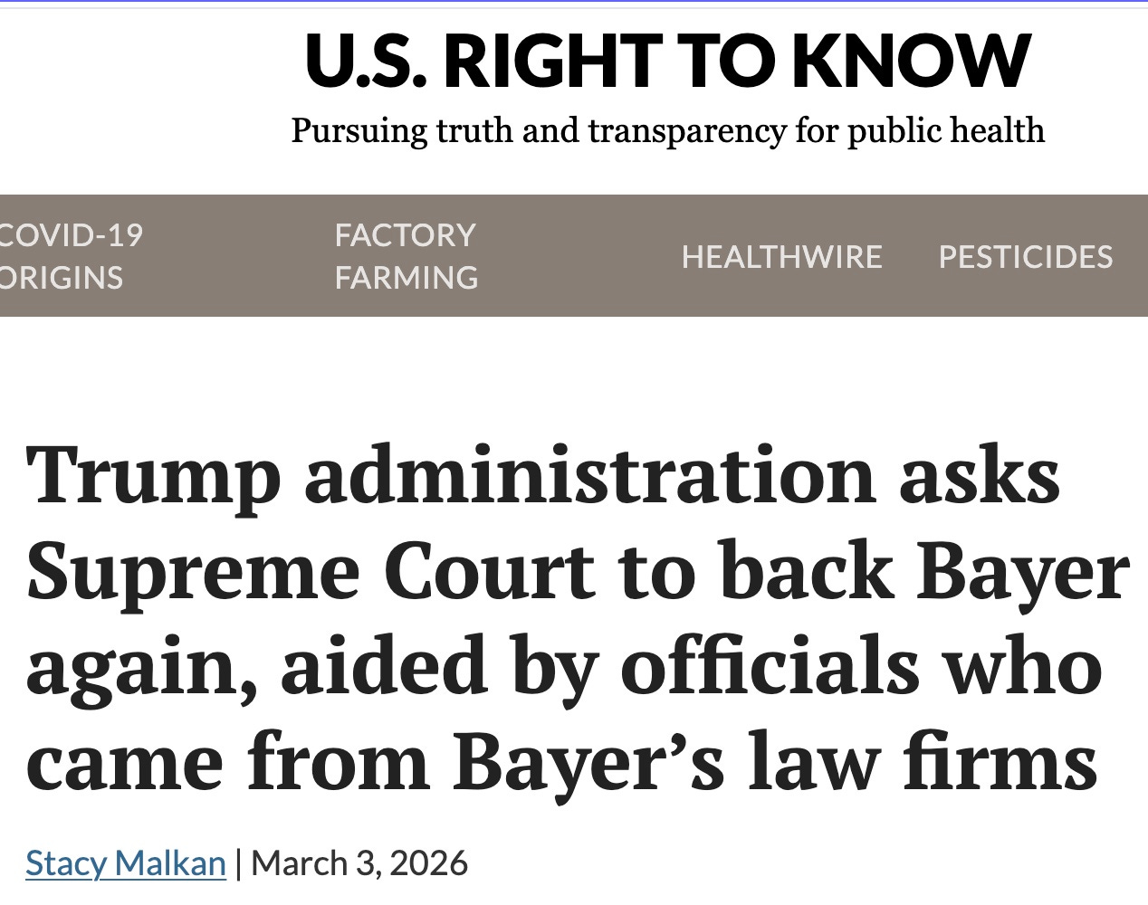We reviewed the company’s ties to the Trump administration and found numerous connections between Bayer’s lobby and legal firms and senior officials in decision-making positions affecting pesticides regulations, chemical safety, and how our nation’s food system is shaped. The new Supreme Court filing adds more Bayer ties.