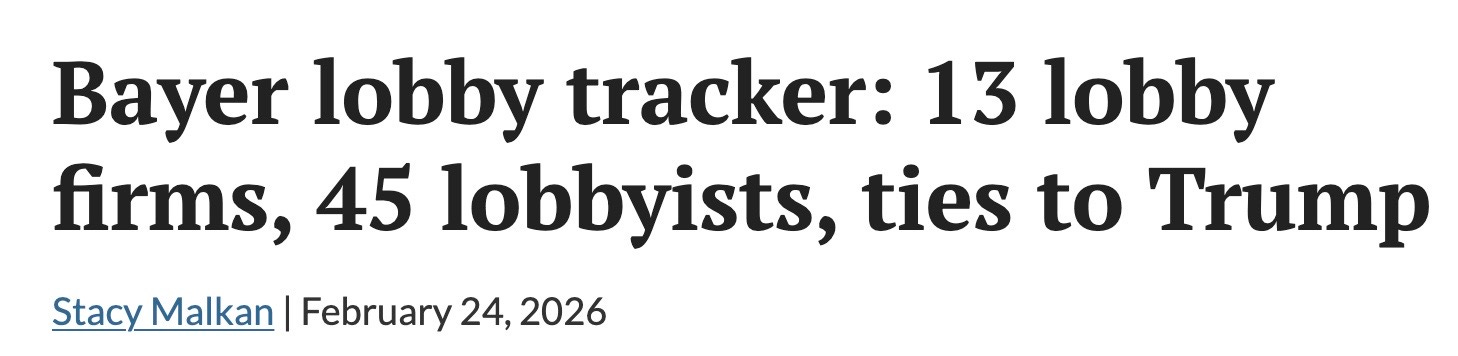 See our recent investigation into Bayer’s ties to top officials in the Trump administration. Our Bayer lobby tracker provides information about the 45 lobbyists registered to lobby for Bayer as of the fourth quarter of 2025, the 13 lobby firms retained by Bayer, and dozens of leadership personnel at those firms who worked for the previous or current Trump administration or Trump’s presidential campaigns.