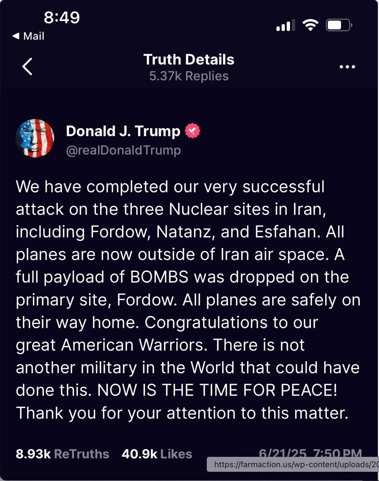 B2 bombers dropped their bunker-busting, 30,000 lb bomb and got away with it, per the president. My pilot friend tells me those B2 planes cost $2 billion dollars each, so one wonders whether the US will continue to risk them without the advantage of surprise.