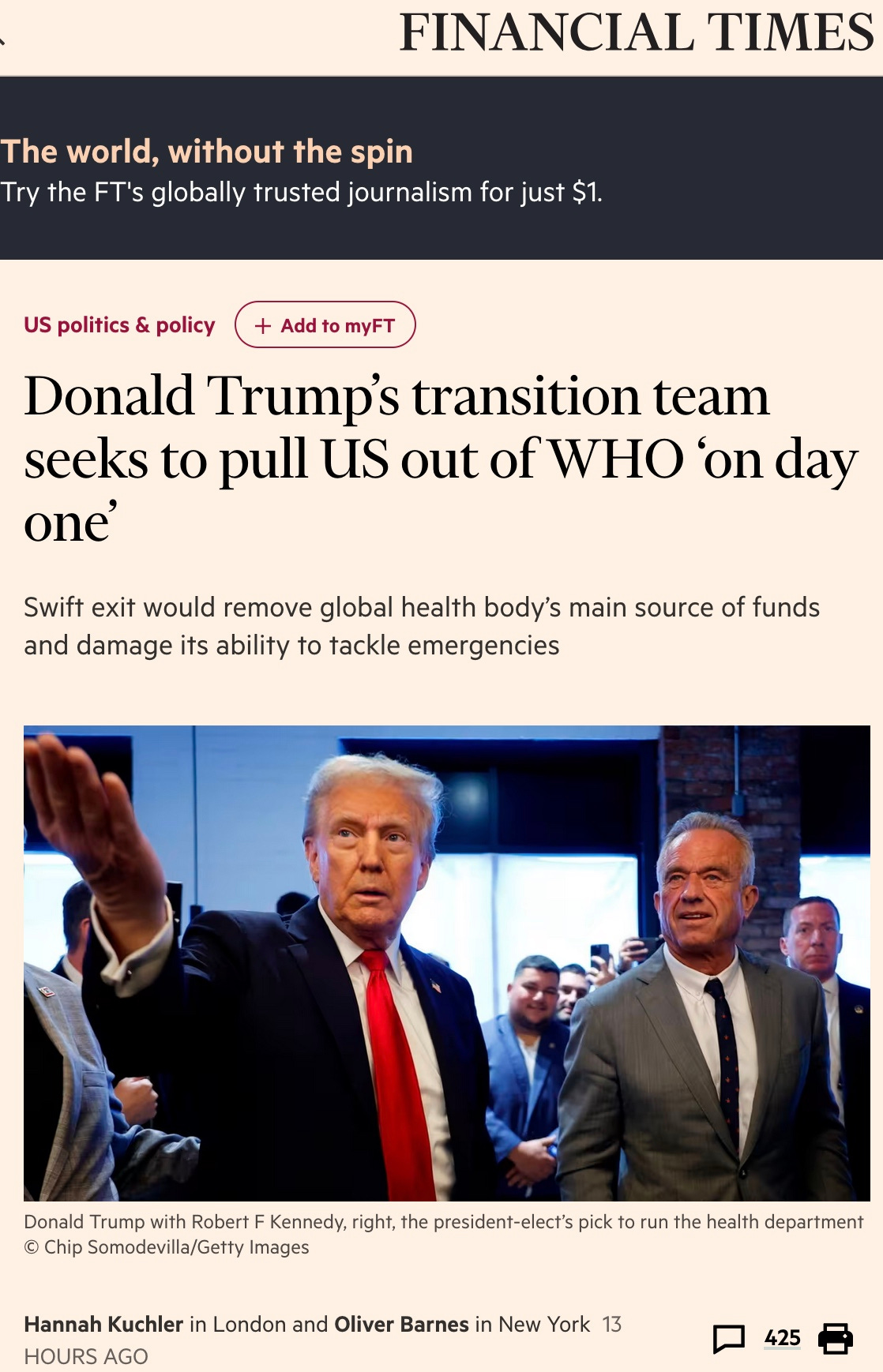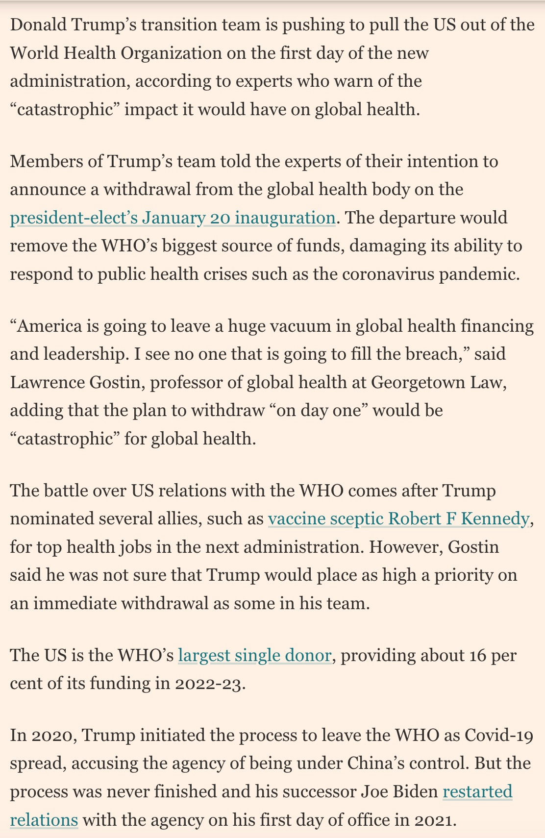 Trump's Team Seeks to Leave the WHO on Day 1, according to the Financial Times