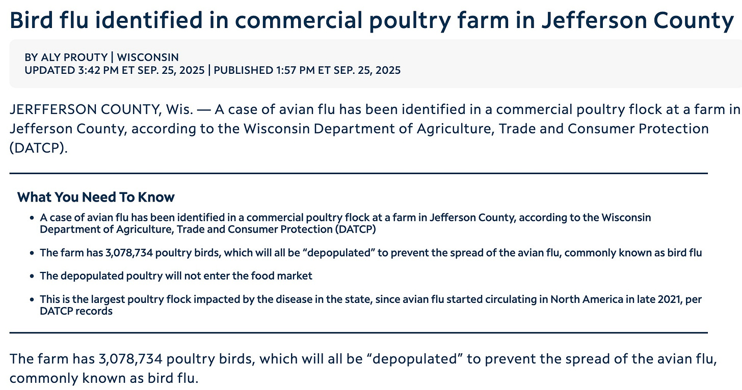 3 million birds are being agonizingly “depopulated” in Wisconsin, while the owner of the birds collects about $17 apiece for them (over $50 million) — the birds are worth more dead than alive. Why is USDA still incentivizing the poultry growers to find bird flu cases? Pay the birds’ owners (who are almost never the farmers themselves) a more reasonable amount and then see how many cases get discovered.