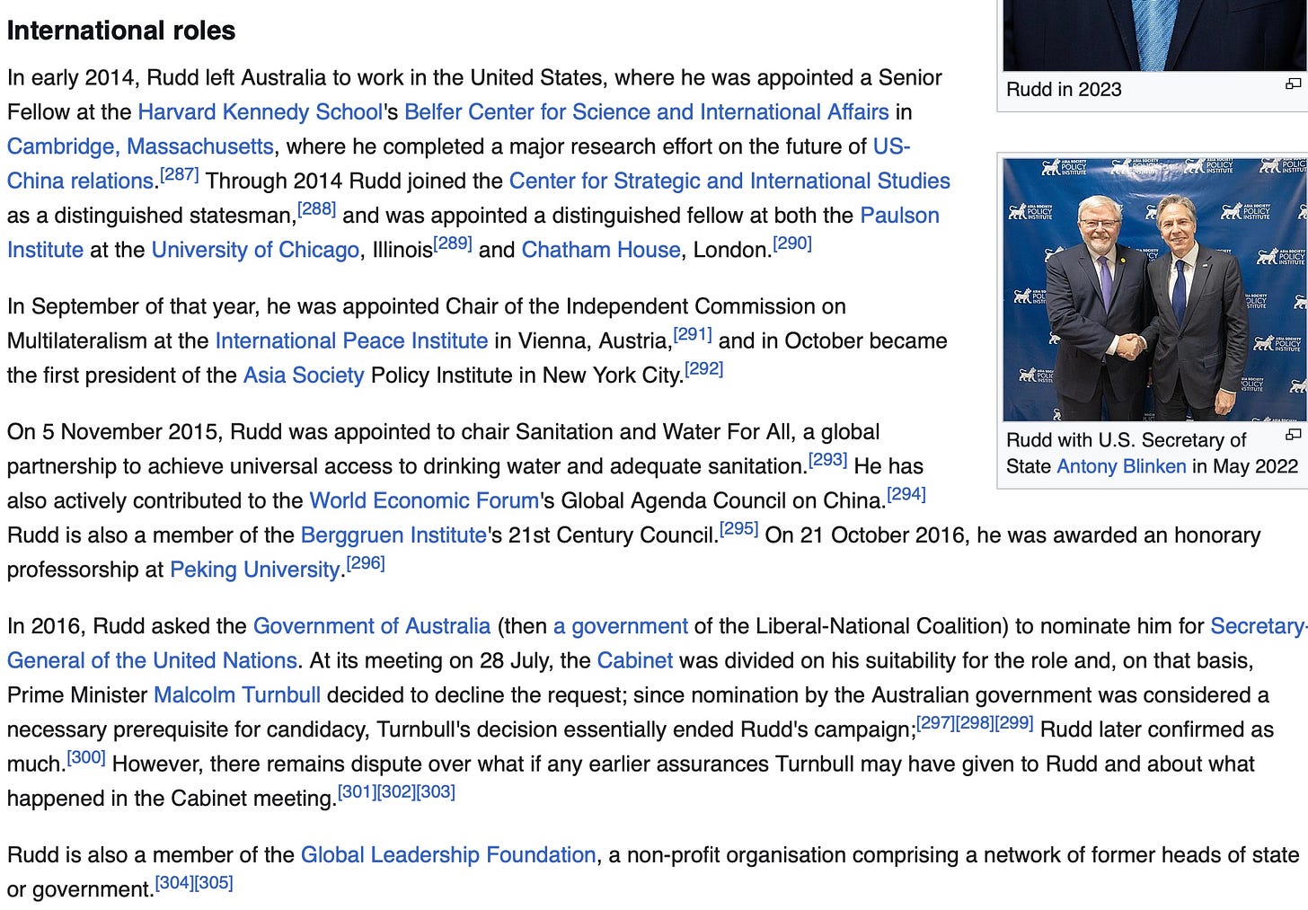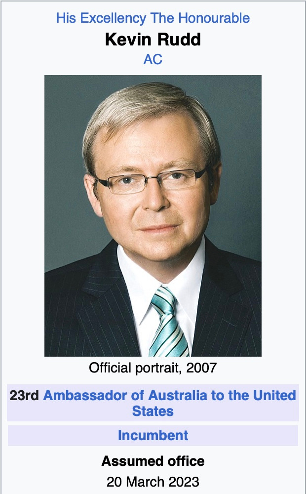 Kevin Rudd, former Australian Prime Minister, who donated Australian taxpayer dough to the Clinton Foundation and then got many plum jobs in the US. Now he is Australia’s ambassador to the US. He sought to become UN Secretary-General.