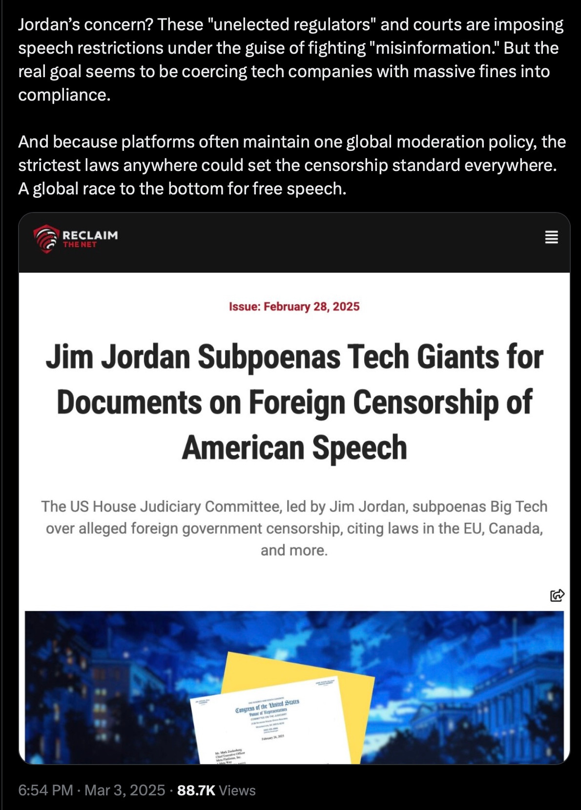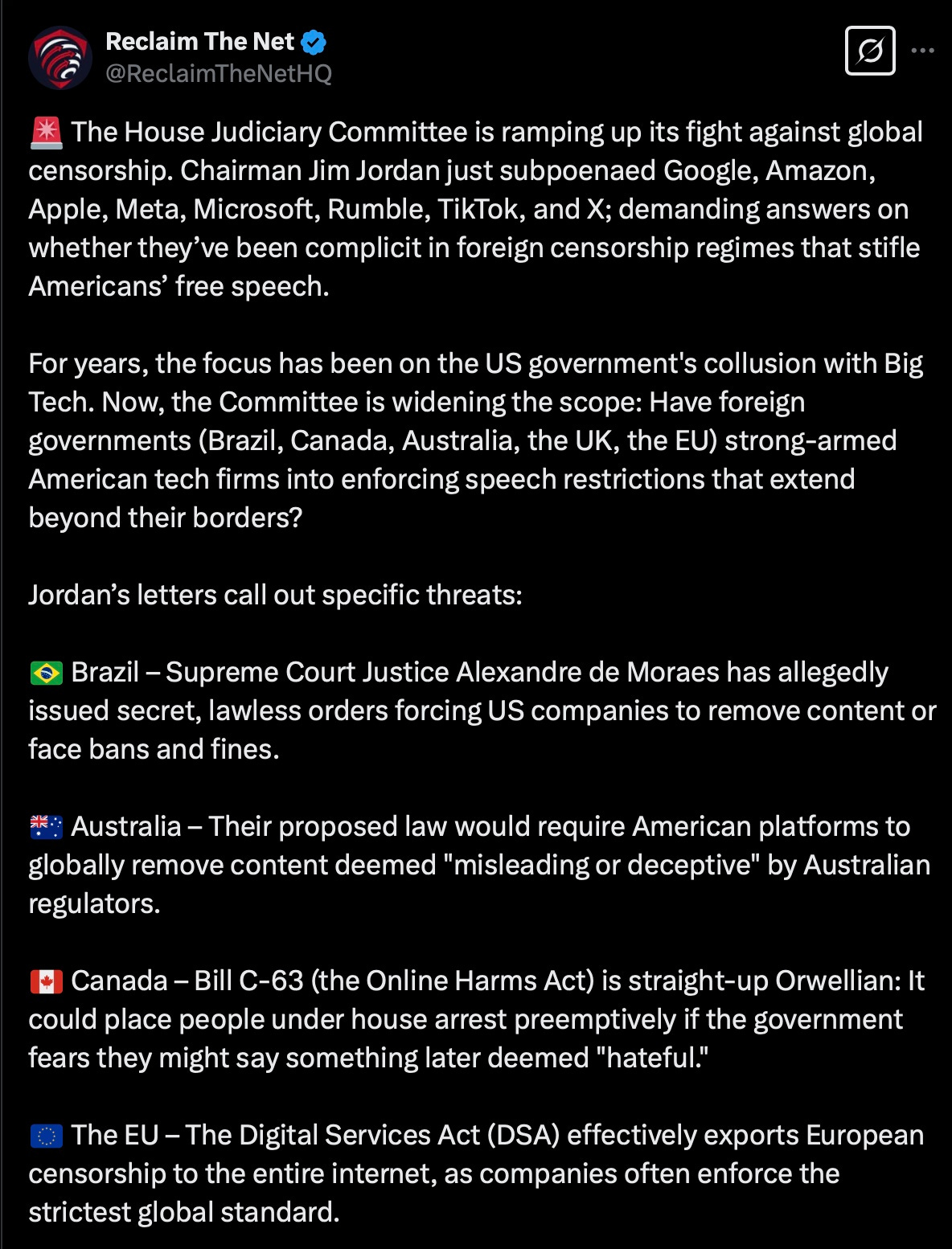 Reclaim the Net lists the countries imposing censorship by social media and how Jim Jordan's Judiciary Committee is investigating to stop it