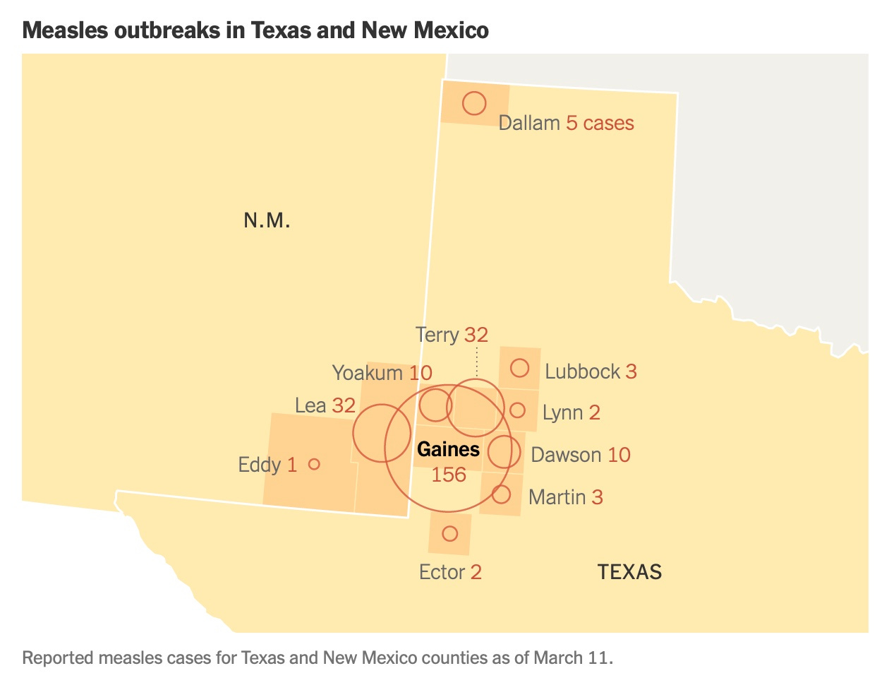 The United States has reported a measles outbreak in Texas and New Mexico with “over 250” cases. Below is the breakdown. Remember, the Texas death (and we still don’t know why that child died) is the first death in a healthy child in the US in more than 25 years. So stay calm and carry on.
