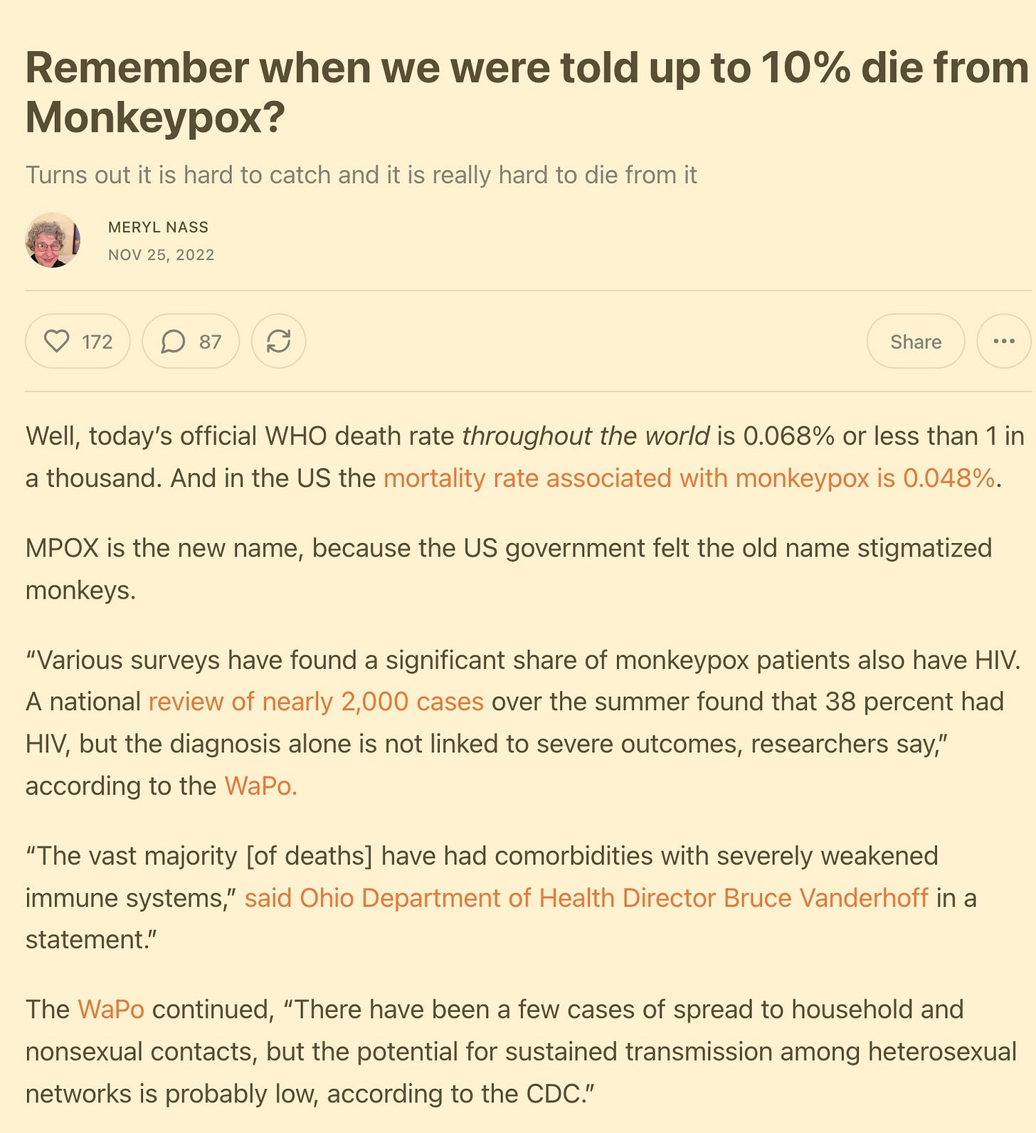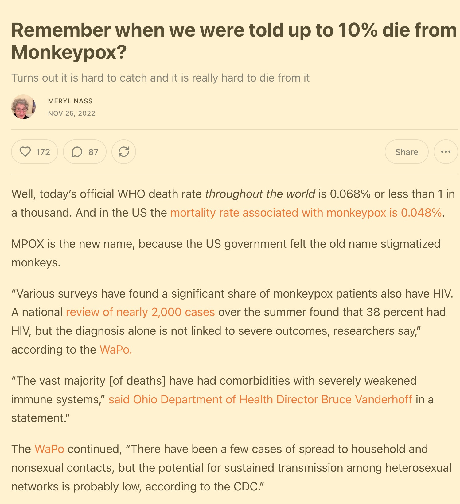 I have written a lot about the monkeypox scamdemic and the vaccines. About 20 prior posts. Here is one, to try and allay fear about this disease. I’m not going to repeat myself. Just remember that everything the media tell you is a lie. No one is claiming the vaccines actually work. But they DO give you myocarditis and other cardiac conditions, at a VERY high rate.