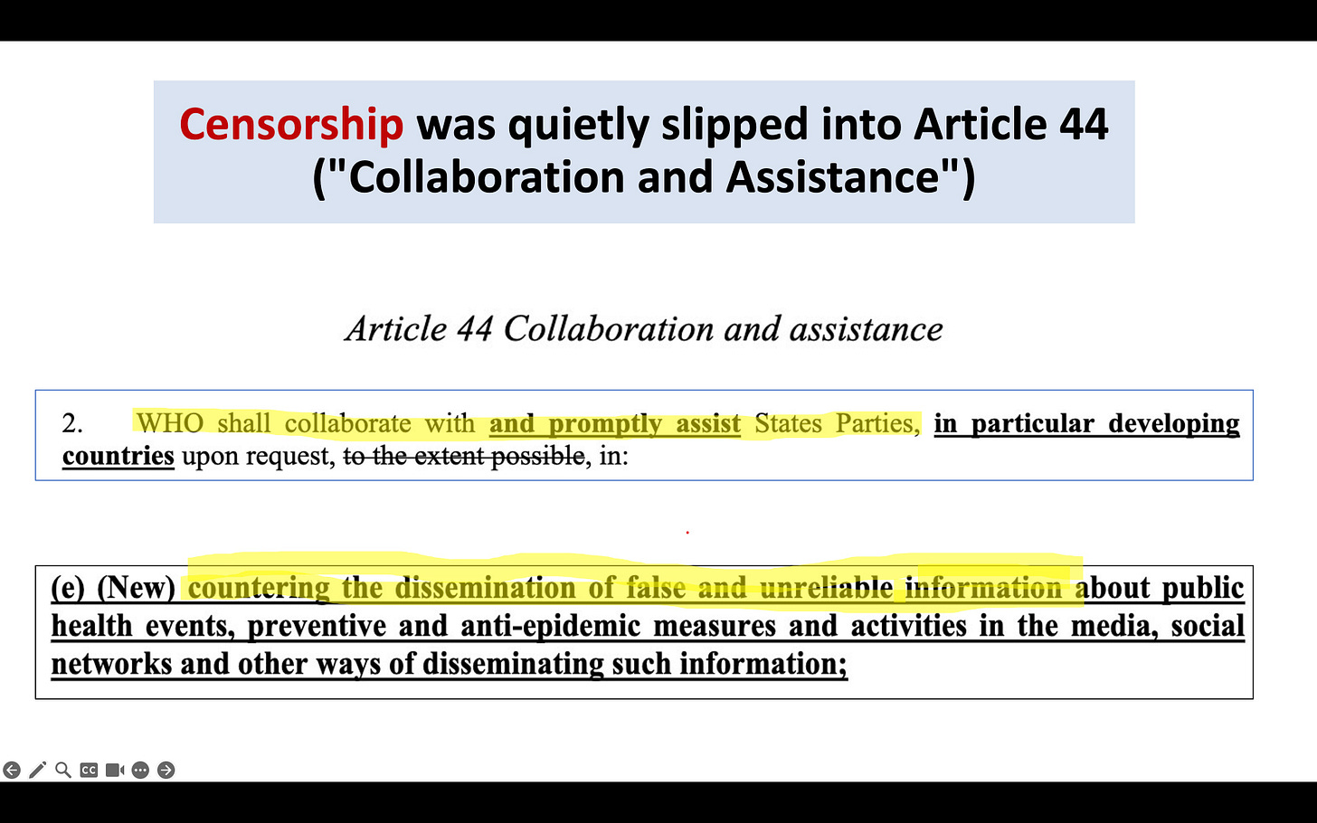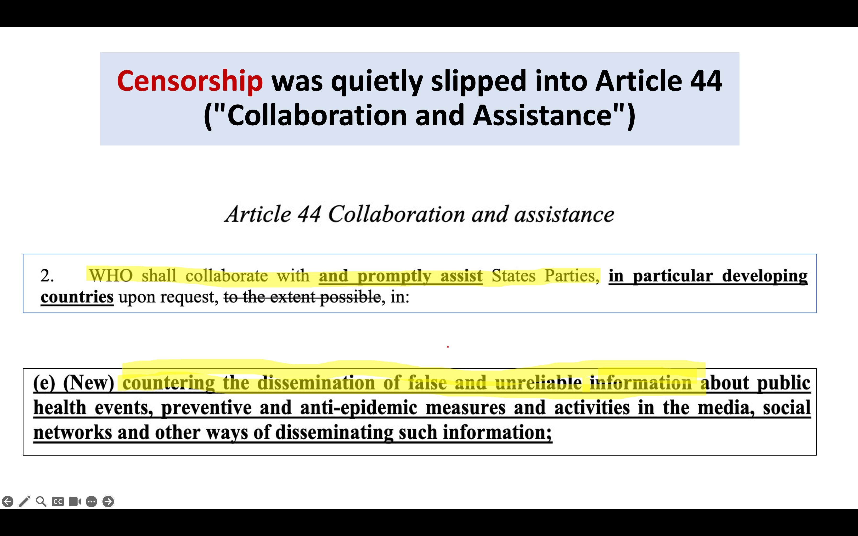 They are committed. And they are very sneaky. Read this, a nugget from the IHR, the same proposed document I started with. Censorship was rolled into the section on how the WHO can assist nations. Assist them in breaking international and probably domestic law. The bolded parts are the new proposals.