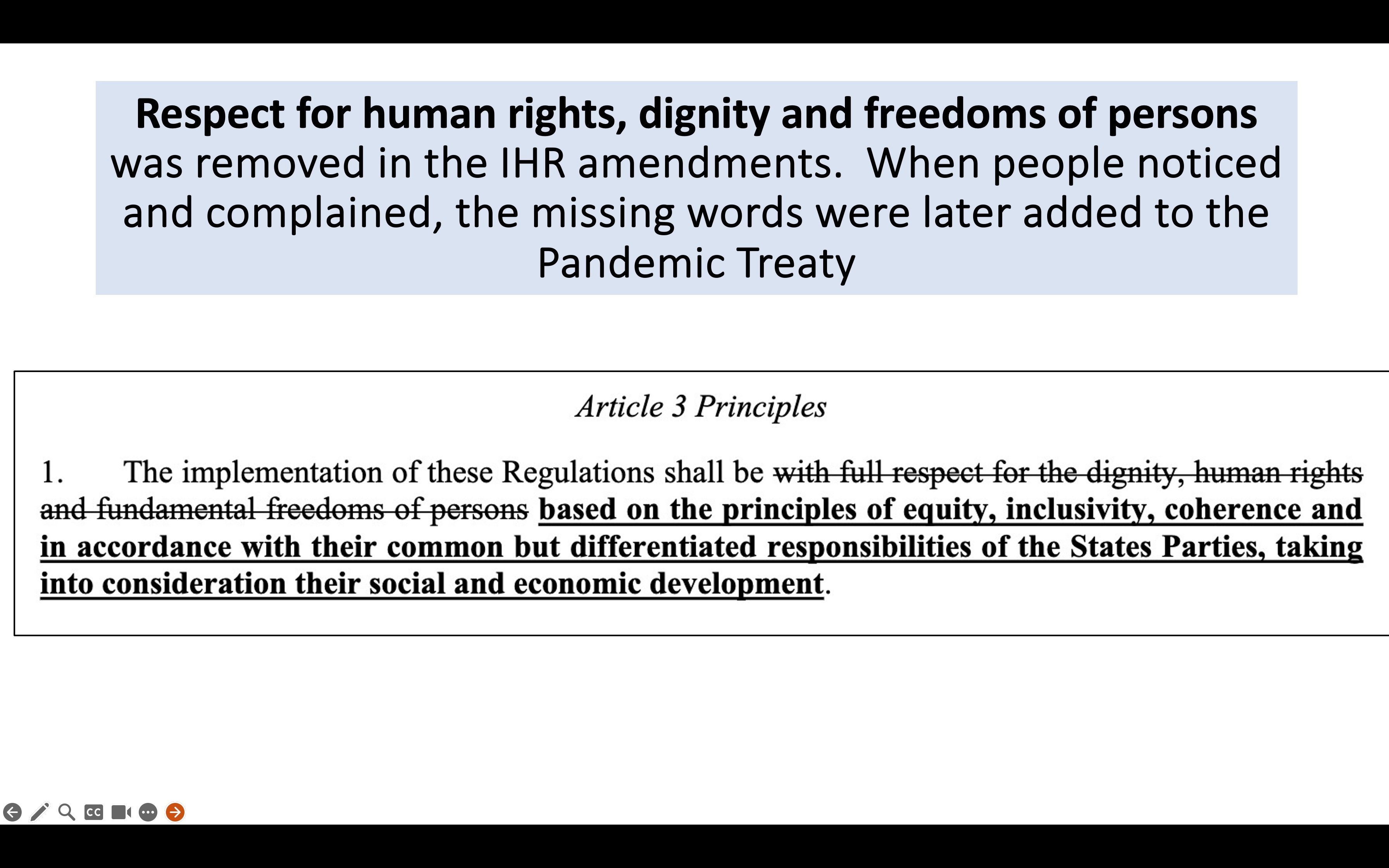 I hope you saw that "With full respect for dignity, human rights and freedom of persons" which are embedded in the current International Health Regulations (IHR) was crossed out in the draft of the IHR amendments prepared by the WHO’s review committee and working group a year ago. All negotiated text since then has been kept under the highest secrecy. So we only have the draft from last February to go on, in trying to understand what the current version of the document might be. Human rights, dignity and freedom of person were to be excluded. See screenshots below.