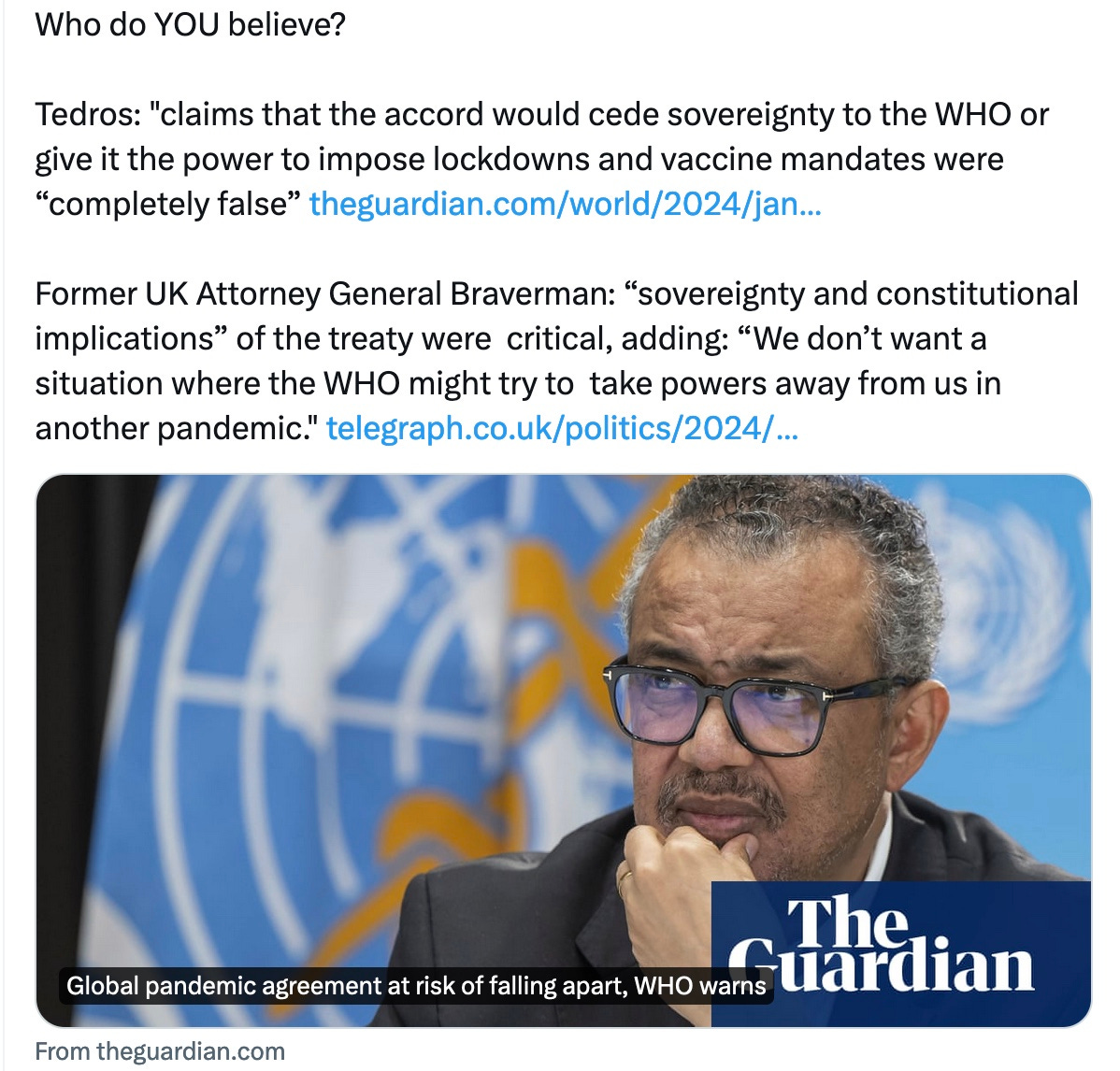 Why would your nation give away its sovereignty over health and information to a corrupt organization run by a bald-faced liar?