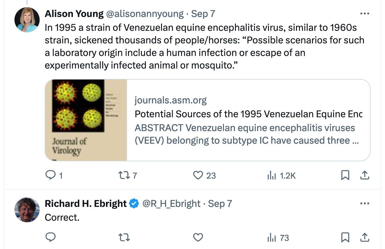 I was pleased to see that Richard Ebright provided confirmation of the awful story of how an equine encephalitis vaccine actually caused the disease it was supposed to prevent. And pleased that her book won awards.